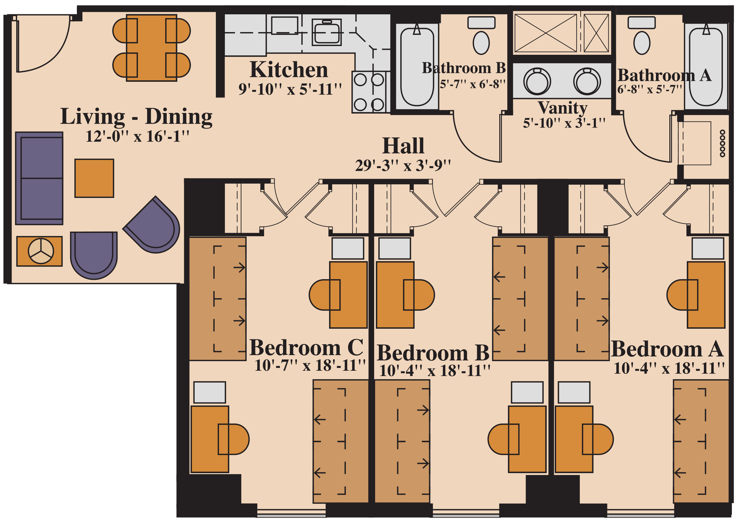 Restrooms are featured inside each apartment. 3-bedroom double occupancy apartments have 2 restrooms. Most single bedroom occupancy apartments have 1 bathroom.