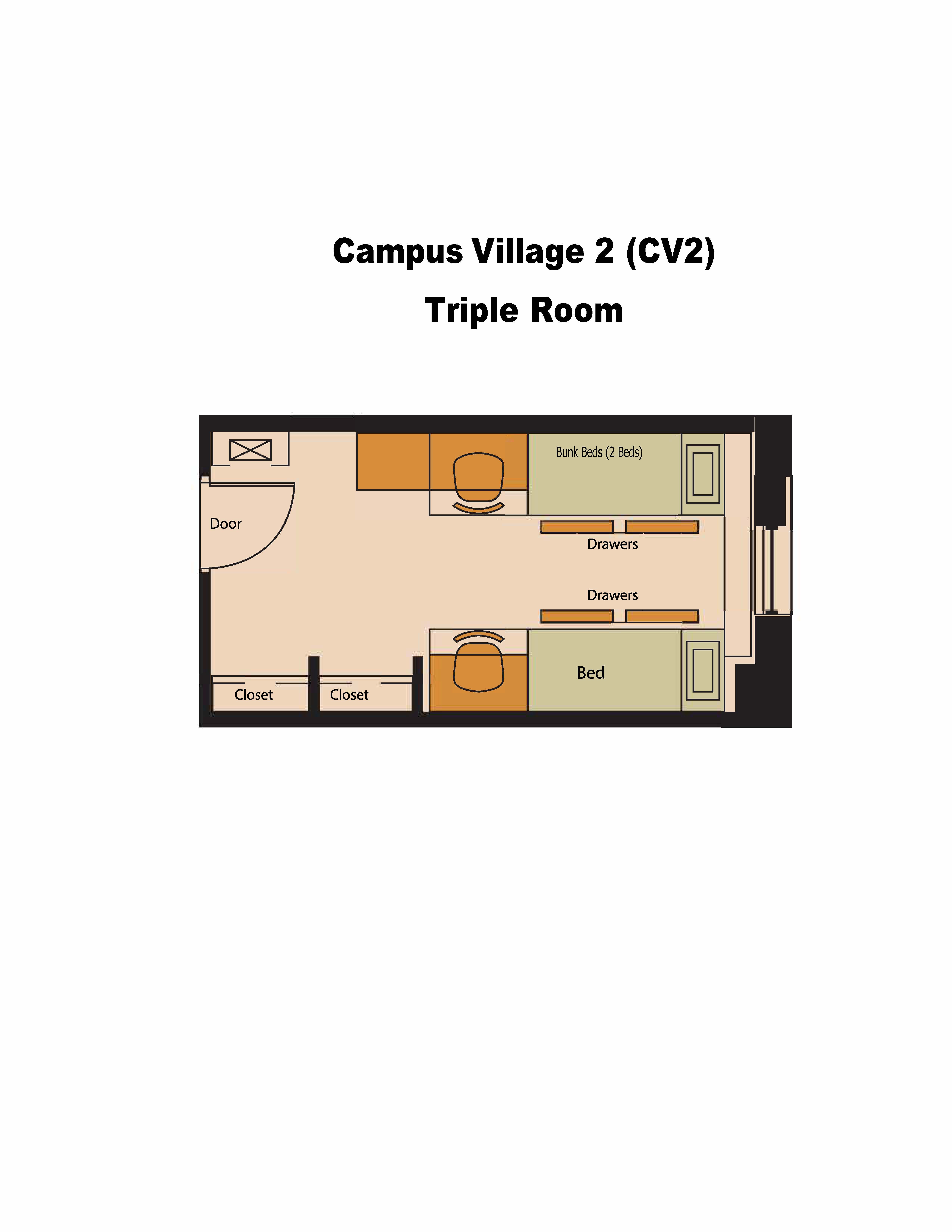 Double & Triple occupancy rooms are designed and furnished for 2 people (for Doubles) and 3 people (for Triples). Housing rent includes basic utilities and Wi-Fi internet access. All residents of Campus Village 2 must purchase a membership meal plan. Double occupancy rooms have one set of twin, extra long beds, which can either be bunked or separated. Triple occupancy rooms have three sets of twin, extra long beds. Two sets will be bunked and the 3rd set will be lofted. Please note that beds are not furnished with pillows, blanket, or other linen.